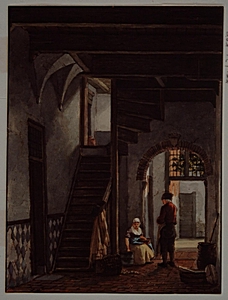 - Afmetingen: Hg. 17, br. 12.7 c.; enigszins gefantaseerde voorstelling; dit huis was destijds een verblijfplaats van bedelaarsgezinnen