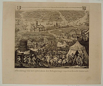 - 8 augustus 1418, het beleg van Dordrecht door Jan van Brabant. Gezicht op Dordrecht aan de landzijde bij vogelvlucht. Links vooraan staat een brandend aanvalswerk, in het midden rukken ruiters op naar de stad. Aan de rechterkant is Hertog Jan te zien voor een veldtent. Bovenaan de wapens van Dordrecht en Beieren.