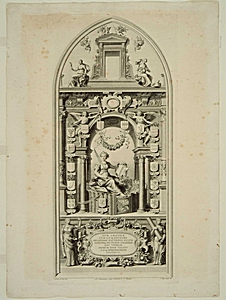 - Afmetingen: Hg. 64, br. 30.5 c. Gravure nummer III naar een tekening van J.C. Boëtius uit een onvoltooid gebleven serie van 7 platen, uitgegeven in 1743 en volgende jaren; deze voorstelling der Dordtse maagd is dezelfde, die in 1618 in beeldwerk aangebracht is aan de buitenzijde der Groothoofdpoort.