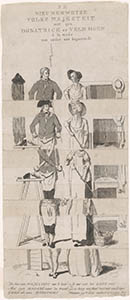 - 1784, Juli. Spotprent op de burgerwapening en de bevordering daarvan, door het aanbieden van vaandels, trommen en dergelijke en het bijeenbrengen van gelden door Patriotistische dames. Zgn. keerprent, die eerst een gewapende schutter met een welgeklede dame en daarna, omgevouwen, een handwerksman met zijn vrouw in hun armoedige woning te zien geeft.