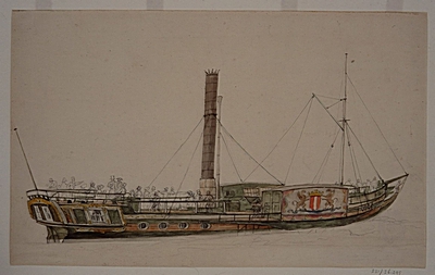 - hxb: 34 x 55 cm. Deze eerste boot, de Prins Frederik, is in de vaart gebracht in 1825. Zij was gebouwd op de werf van Jan Schouten te Dordrecht, werd 2 april 1825 te water gelaten en droeg oorspronkelijk de naam De Vereeniging. (Dordr. Courant van 5 April 1825). In de lijst van op de werf van Schouten gebouwde schepen, wordt zij Prins Frederik genoemd. Volgens de Dordr. Courant van 28 juli 1825 voeren toen reeds tussen Rotterdam en 's-Gravendeel de stoomboot De Eendragt en het stoomjacht Prinses Marianne.