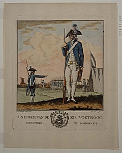 Uniform van de schutterij van St. Joris of Ed. Voetboog. Onder de prent het embleem van …