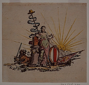 - Ontwerp voor een schuttersvaandel met vrijheidsmaagd, vrijheidshoed op een speer, waaraan een lint is gehecht, met opschr.: Getrouw voor Stad en Vaderland. Zij steunt op een zuil, waarop Biblia en waarnaast een liggende leeuw met zwaard; haar linkerhand rust op het Dordtse (abusief gekleurde) wapen, achter haar een rijzende zon.