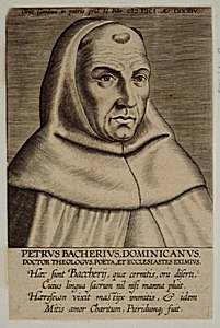 - hxb: 16,5 x 10,8 cm. Uit: A. Miraeus, Illustr. Galliae Belgicae scriptorum icones et elogia Antw., 1604 of uit de 2e uitgave uit 1608. (v.S. Dl 1 129 a en b 15-15) Petrus Bacherius werd geboren te Gent 1517 en overleed 1601. Hij was Dominikaner monnik en hoogleraar te Leuven. Hij was bekend om zijn redenaarstalent en heeft ook in Dordrecht gepredikt.