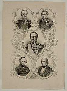 - Portret van Ary Scheffer (linksonder) samen met portretten van vier andere heren uit het midden van de 19e eeuw, waaronder de generaal St. Arnaud en Lord Raglan.