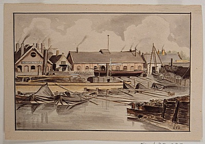- Afmetingen: Hg. 10, br. 14.7 c.; de fabriek is daar gevestigd geweest vanaf 1869 tot de verhuizing naar de Lijnbaan aan het Wantij in 1897; tekening gemaakt naar een foto uit 1887