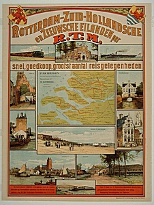 - Reclameplaat van de Rotterdamsche Tramweg-Maatschappij met een kaart van het lijnennet der R.T.M. op de Zeeuwse en Zuidhollandse eilanden, omgeven door een negental afbeeldingen van met de tram bereikbare plaatsen als Dordrecht, Oud-Beijerland en Rijsoord en afbeeldingen van vervoersmiddelen.