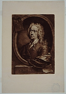 - Zwarte kunst gravure, afgedrukt in bruin, naar schilderij van A. Schouman; afmetingen Hg. 26.5, br. 18.8 c. Nota Bene: Betreft Adriaan van der Burg of Burch, geboren te dordrecht 1690, overleden aldaar 1733; kunstschilder.