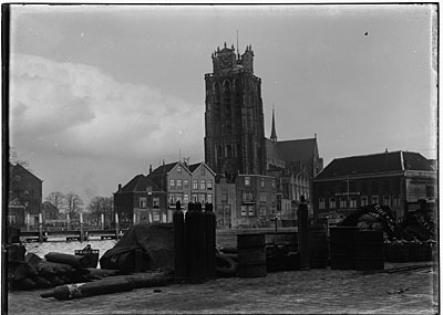- De Grote Kerk gezien vanaf de Bomkade over de Bomhaven. De huizen voor de kerk staan aan de Korte Geldersekade. Rechts naast de kerk is de Leuvebrug zichtbaar. Geheel links ligt de Mazelaarsstraat en rechts daarvan de Mazelaarsbrug.