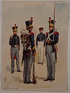 - Uniformen der Pontonniers van 1814-1829. Pontonniers in 1822. In blauwe uniform.