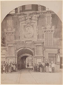 - De Groothoofdspoort aan de rivierzijde. Achter de poort Pennock's Hotel in de Palingstraat. De rails zijn voor de paardentram.