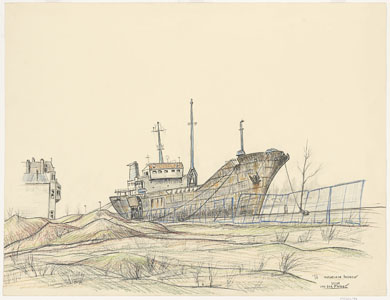 De Merwekade met een aangemeerde coaster, links de Hoefijzerstraat.
