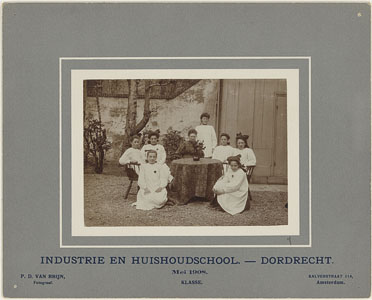 - Leerlingen van Industrie- en Huishoudschool Doelesteyn aan het Steegoversloot op de binnenplaats van de school: poseren.