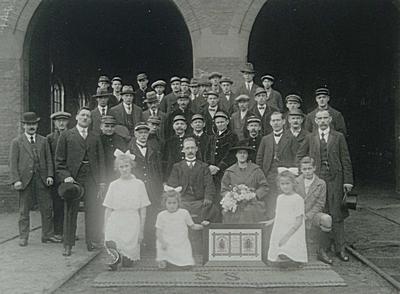 - Spoorwegpersoneel bij de viering van een huwelijk voor de locomotievenloods aan de Burgemeester de Raadtsingel
