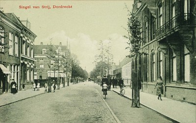 De Van Strijsingel vanaf de Hoogt richting Spuiweg. De R.K. kerk (rechtsmidden) staat op de hoek van de Koninginnestraat.
