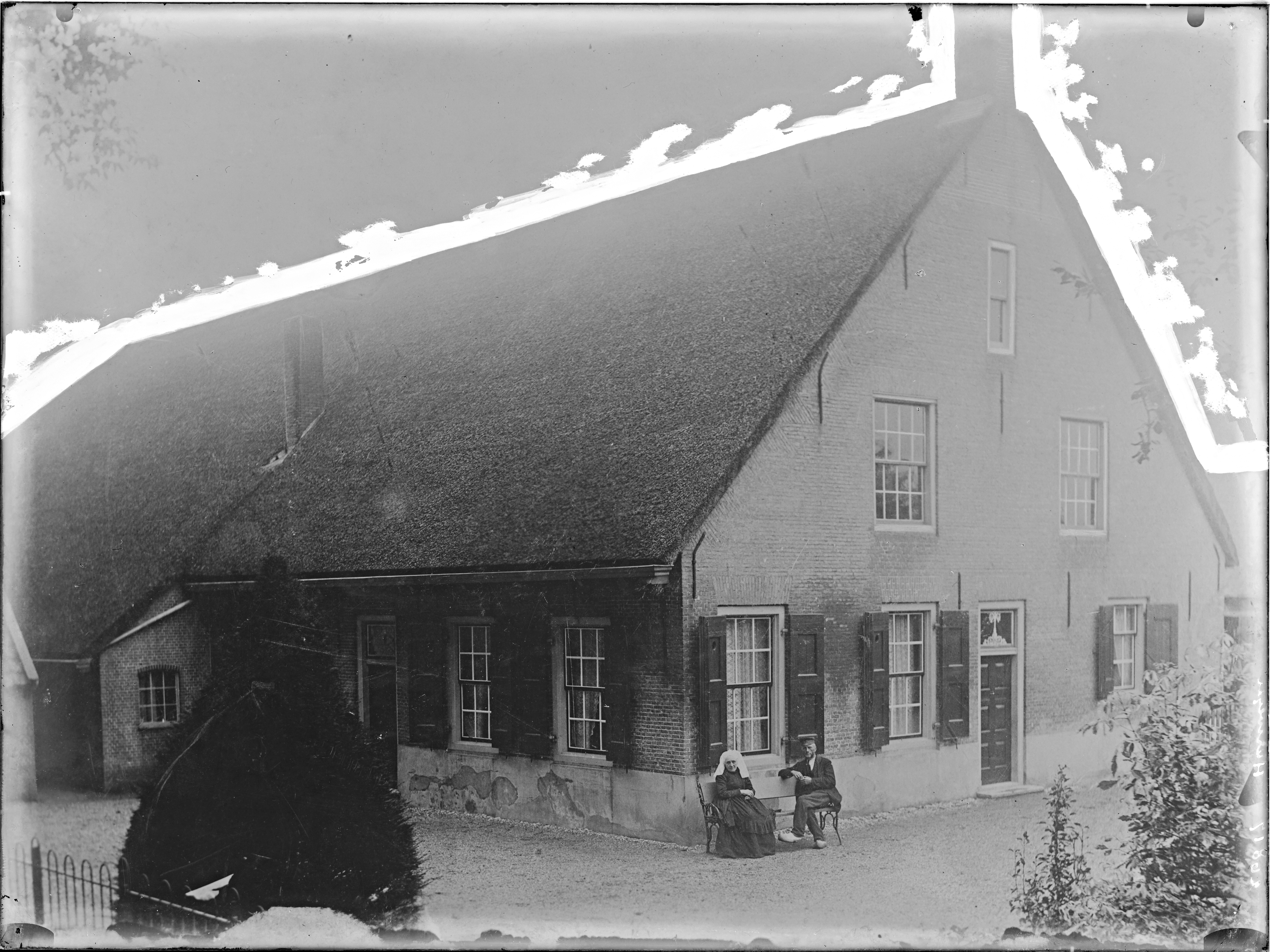 boerderij met zittend echtpaar, waarvan de vrouw in Zuidhollandse klederdracht (keuvel)