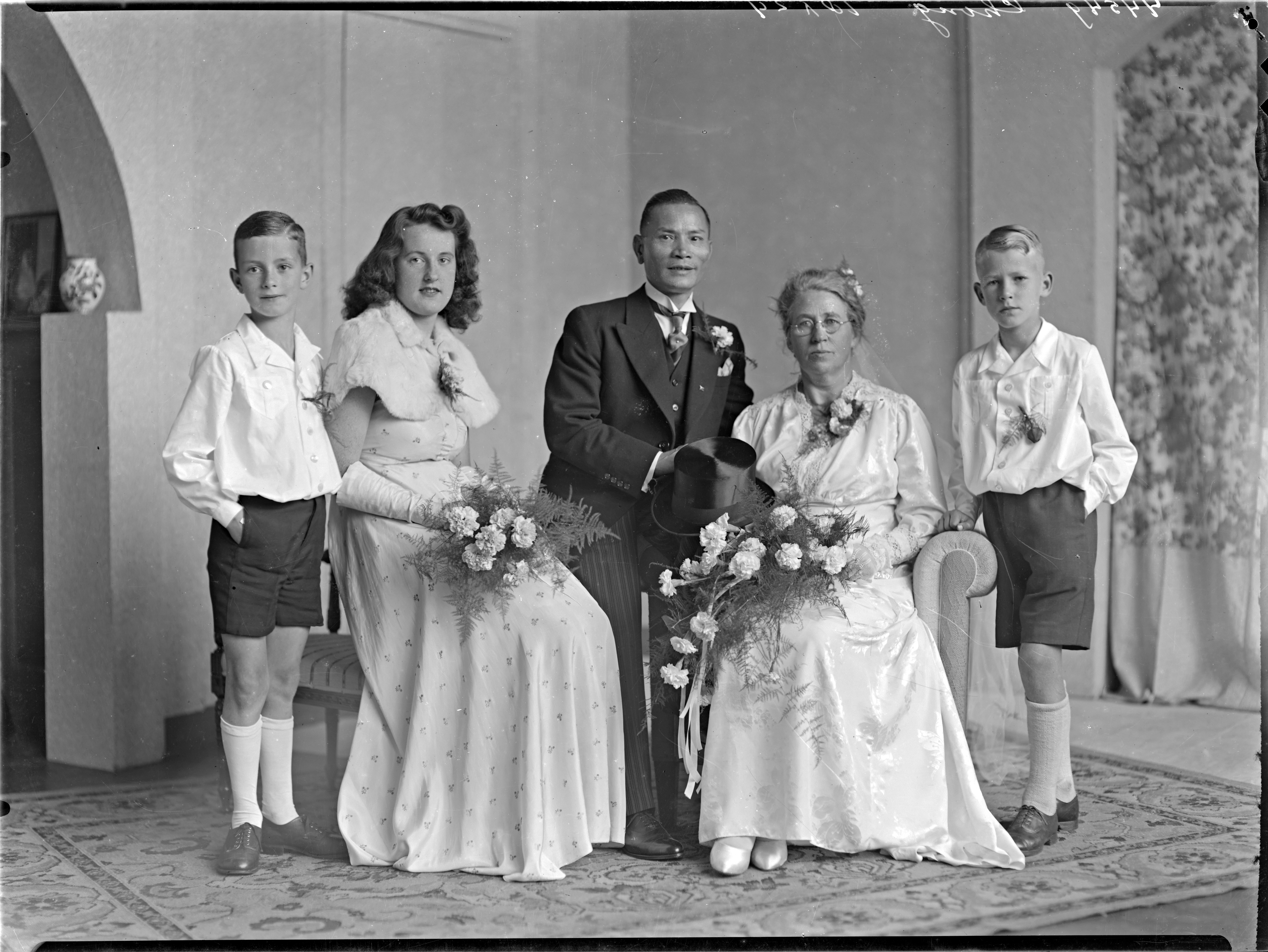 bruidspaar, Chinese bruidegom, bruidsmeisje, kinderen --- 08-08-1945 fotonummer 44549 Chong Transvaalstraat 24zw [bron: www.dordtenaZOEKer.nl] ---- WONINGKAART 1944 Transvaalstraat 24zw Din Yon Chong (geb. Wong Pei Lin [China] 25-11-1900; koopman)(geb. Kwantoeng Powong 26-11-1900, winkelier) / Adriana J. Berg