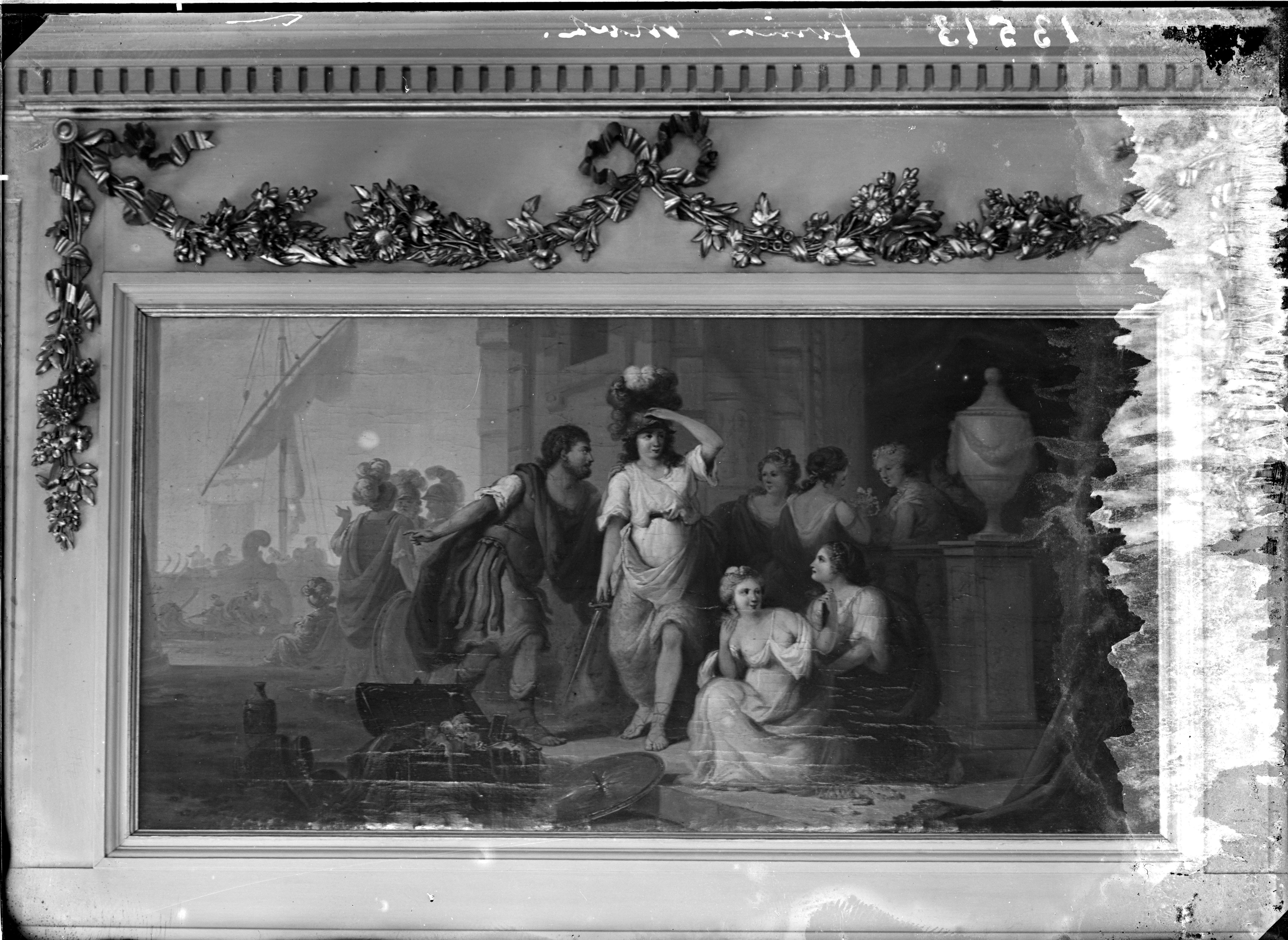 Odysseus ontdekt Achilles temidden van de dochters van Lycomedes (Ovidius Metamorfosen XIII 162-129) dubbelbovendeurstuk, doek 70 x 132 cm Dordrecht Houttuinen 36 Dudok Real Estate In opdracht van Arnold van Poeliën gemaakt in of na 1769
