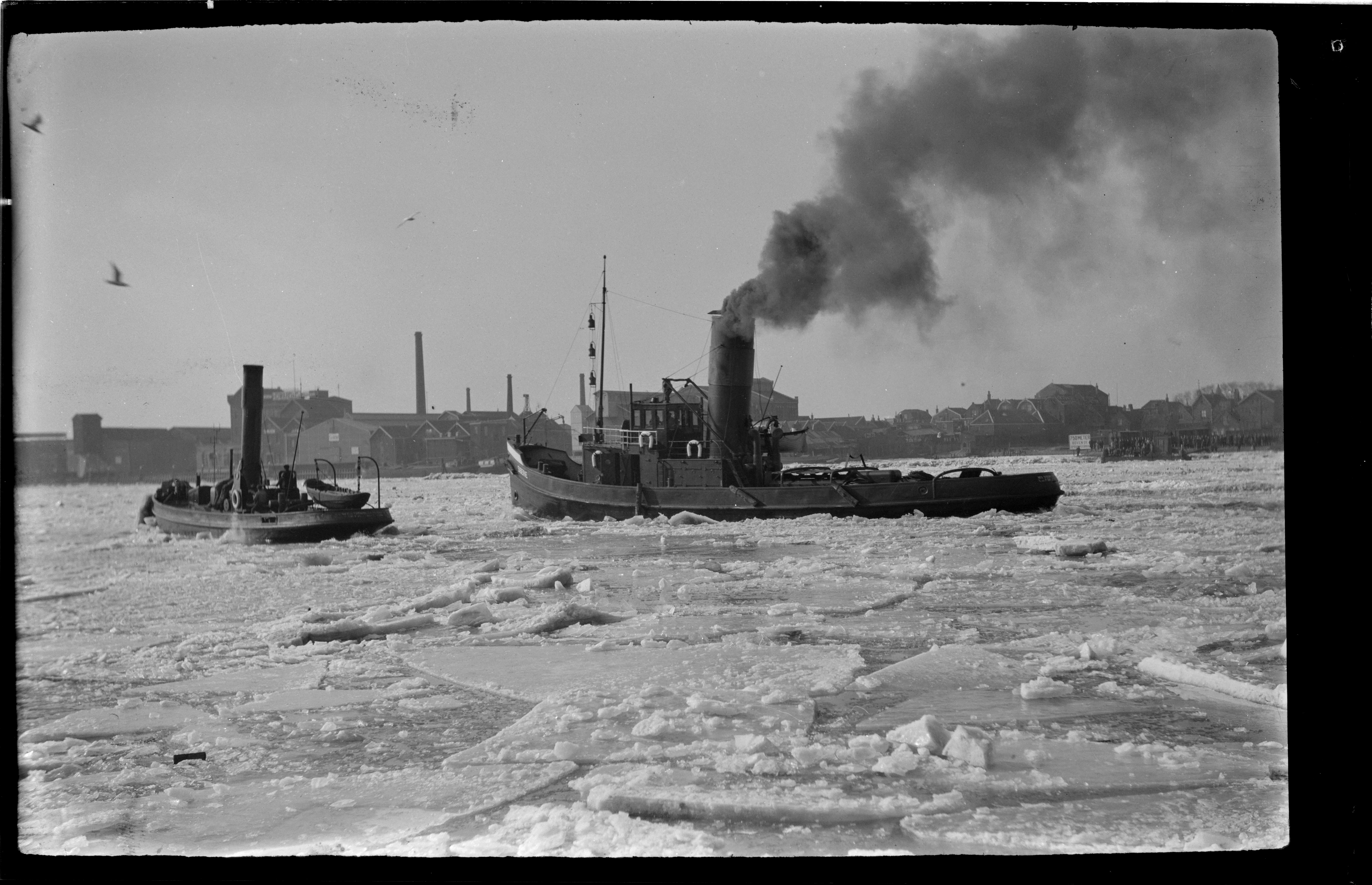 IJsbrekers op de Oude Maas, Zwijndrecht op de achtergrond.