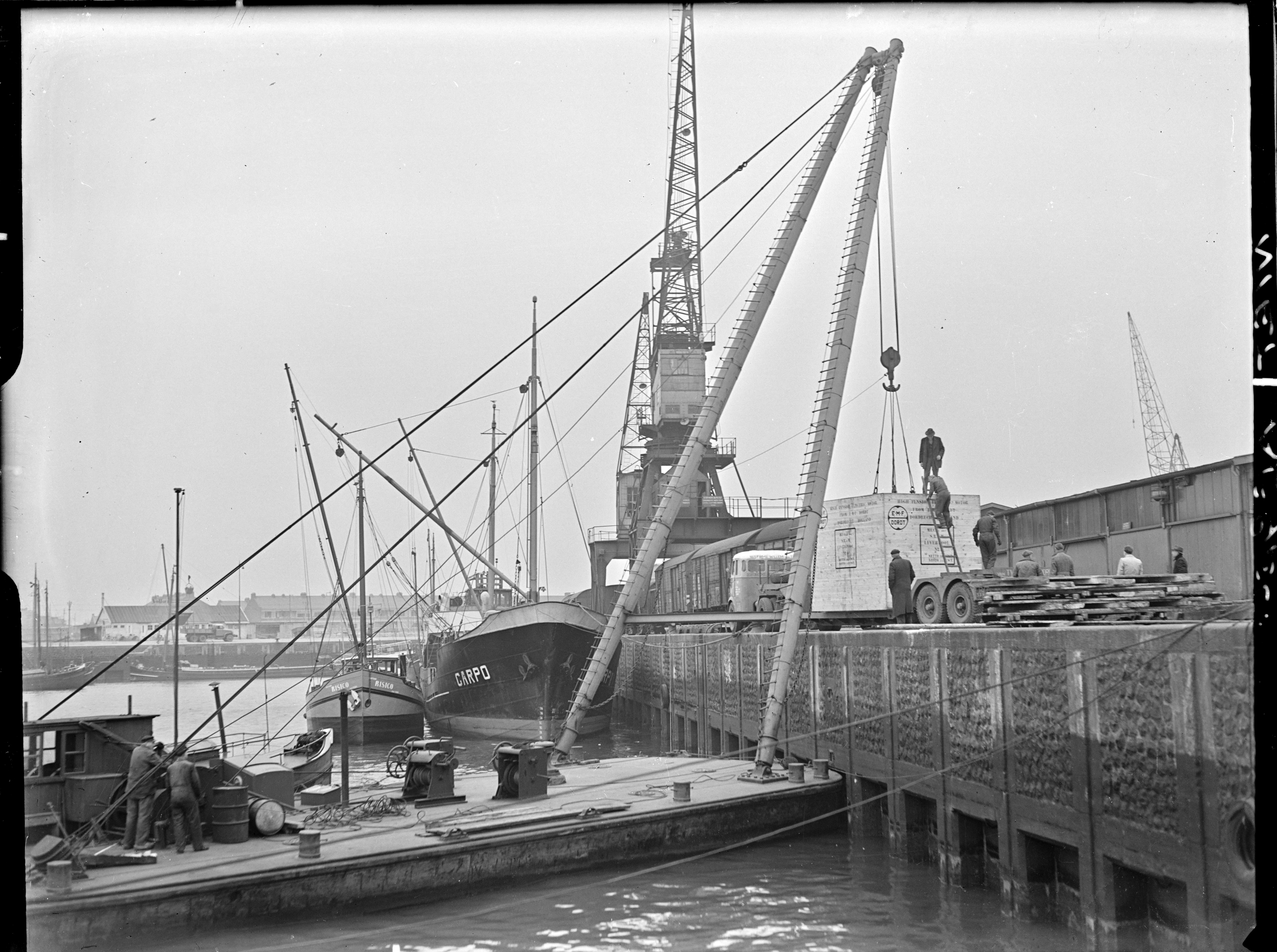EMF hoogspannings elektrische motor wordt geladen in de Merwehaven in Rotterdam. Op de achtergrond de bovenste verdieping van de flatgebouwen aan de Schiedamseweg Beneden