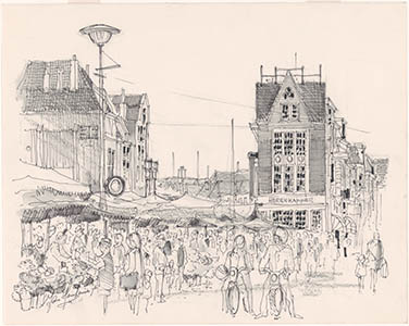 Tekening door Jan Hensema van de markt op het Scheffersplein. Links de Wijnstraat, …