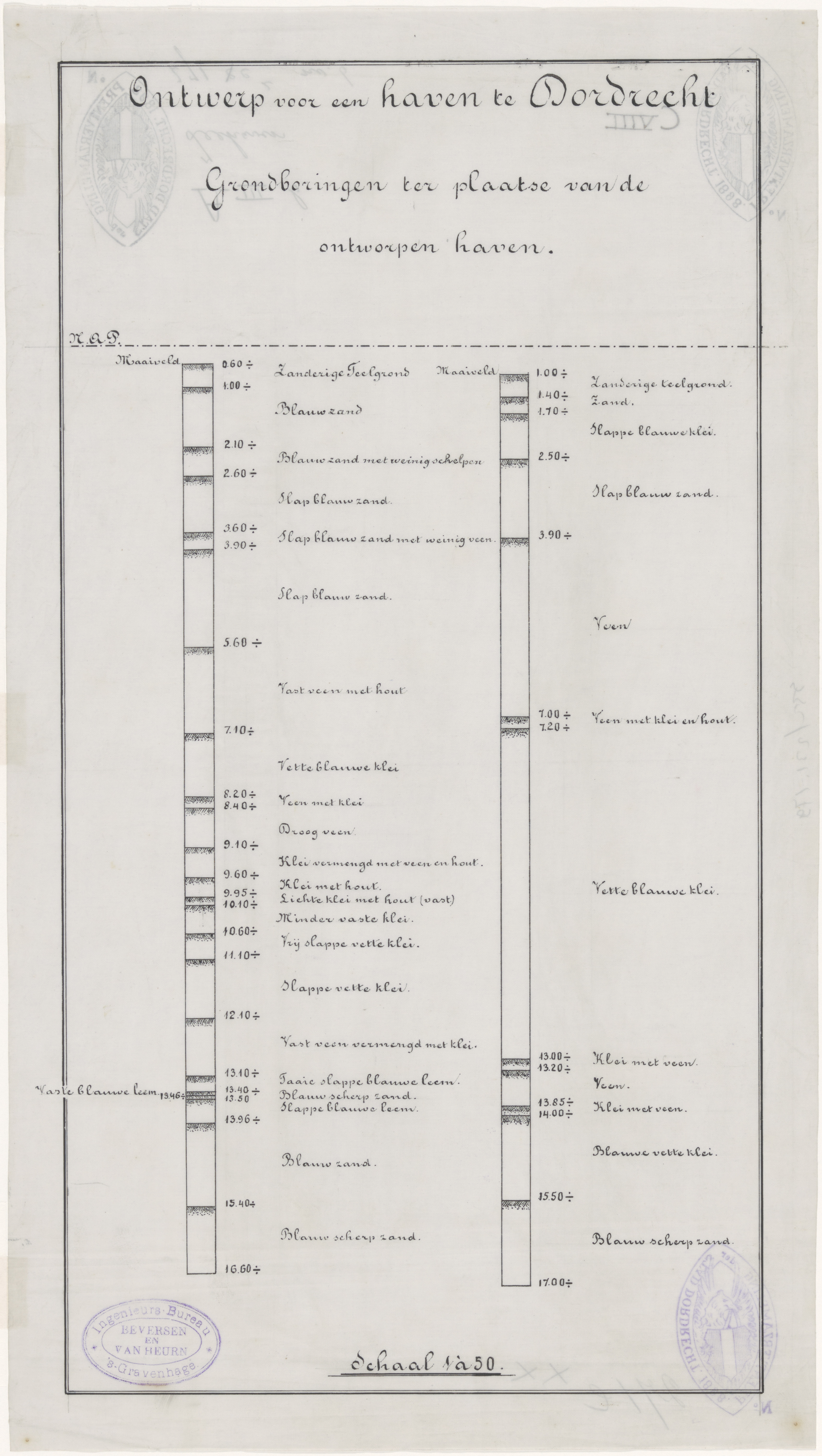 ontwerp voor een haven te Dordrecht, grondboringen ter plaatse van de ontworpen haven (ingenieursbureau Beversen en van Heurn, 's-Gravenhage)
