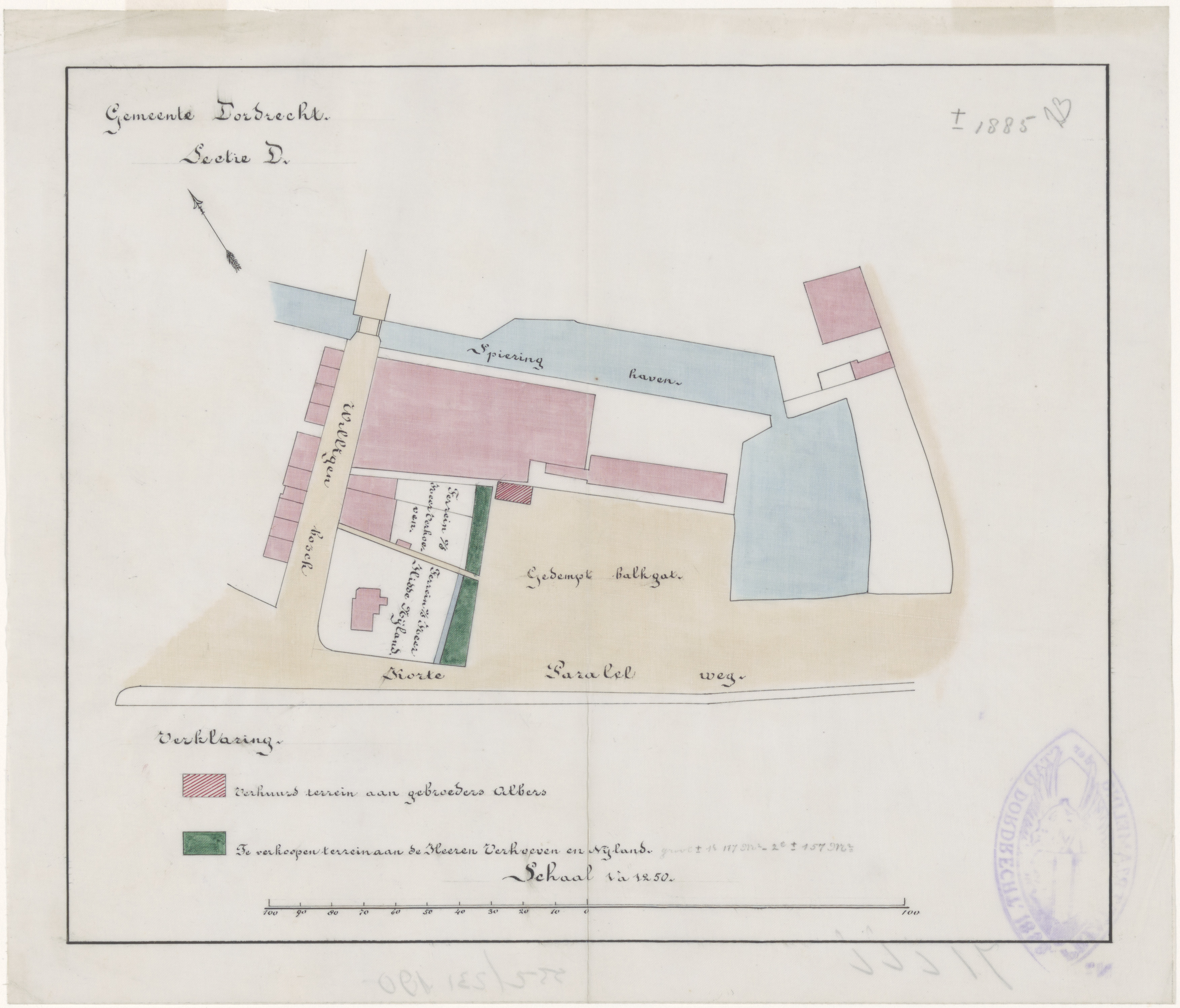 (ca 1885, sectie D) kadasterkaart, kadastrale kaart, tekening .... Spieringhaven, Willigenbosch [Wilgenbos], gedempt balkgat, Korte Parallelweg, terrein gebroeders Albers, terrein Heeren Verhoeven en Nijland