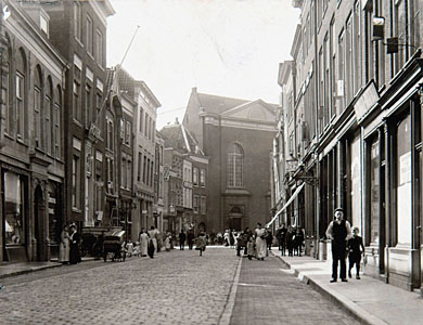 - De Voorstraat tussen Nieuwbrug en Steegoversloot met de Augustijnenkerk op de achtergrond. Links vooraan de Muntpoort. Bij de hondenkar is gebouw Pictura.