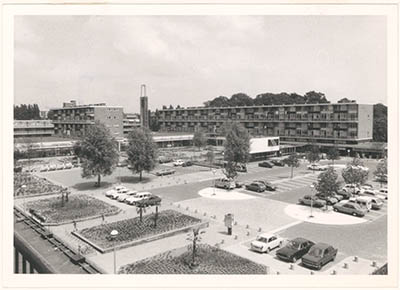 - Van Oldenbarneveldtplein met winkelcentrum Crabbehof, gezien richting Stefanuskerk aan de Talmaweg.