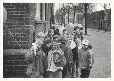 - Schoolklas in de Museumstraat bij de hoek van de Kolfstraat. Rechts de Arend Maartenshof.