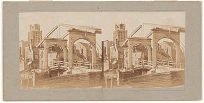 - Stereofoto van de Zuidersluisbrug, gezien vanaf Achterhakkers richting Prinsenstraat en Grote Kerk.