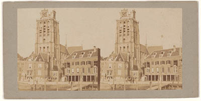 Stereofoto van de Bomhaven richting Korte Geldersekade en Grote Kerk. Rechts de eerste …