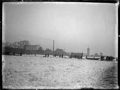 - Overtocht op de dichtgevroren Oude Maas. Op de Zwijndrechtse oever v.l.n.r. flessenfabriek Bottleworks, de watertoren en molen Welgelegen.