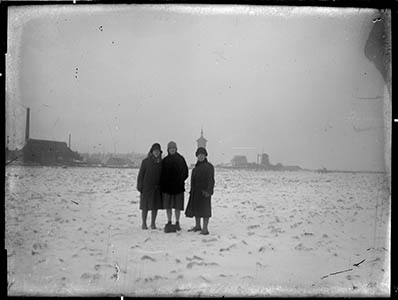 - Voetgangers op de dichtgevroren Oude Maas. Op de Zwijndrechtse oever v.l.n.r. flessenfabriek Bottleworks, de watertoren en molen Welgelegen.