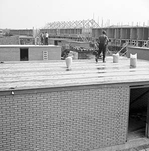 - Bitumen dakbedekking aanbrengen op garages bij nieuwbouw aan de Haaswijkweg Oost. Op de achtergrond huizen in aanbouw in de Laurierstraat.