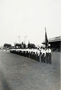 - jubilea muziekkorpsen publiek / toeschouwers sportterreinen tribunes verenigingen vlaggen(stokken)
