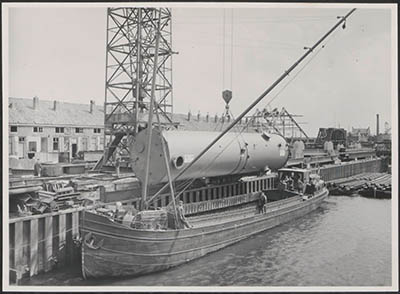 - Het laden van een vrachtboot in de Oude Maas voor transport van een bij Penn en Bauduin aan de 's-Gravendeelsedijk vervaardigde tank.