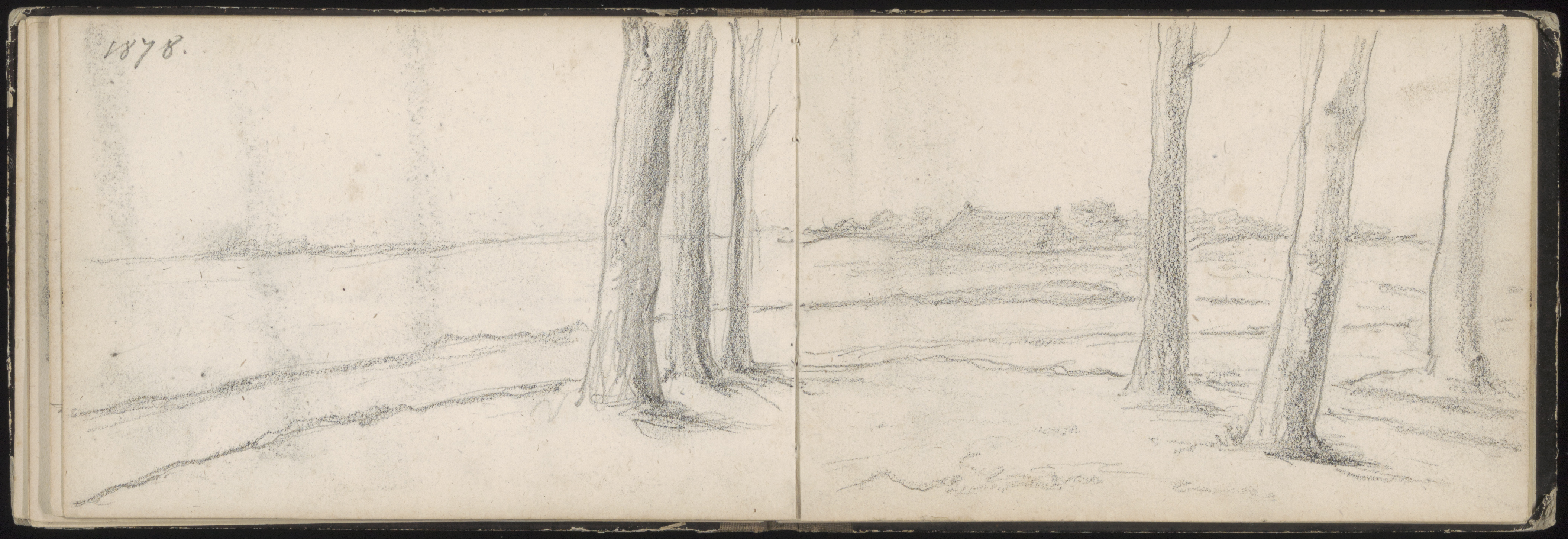 (1878; sloot, bomen, dak) schetsboek Bendorp 1861-1882 [Carel Frederik Bendorp (de jonge) 1819-1897]