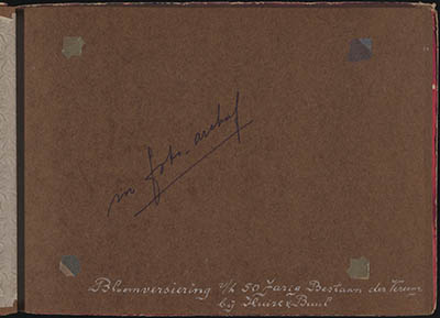 - Bladzij zonder foto's in album van gymnastiekvereniging OKK. Bijschrift: Bloemversiering v/h 50-jarig bestaan der vereniging bij huize v. Buul.