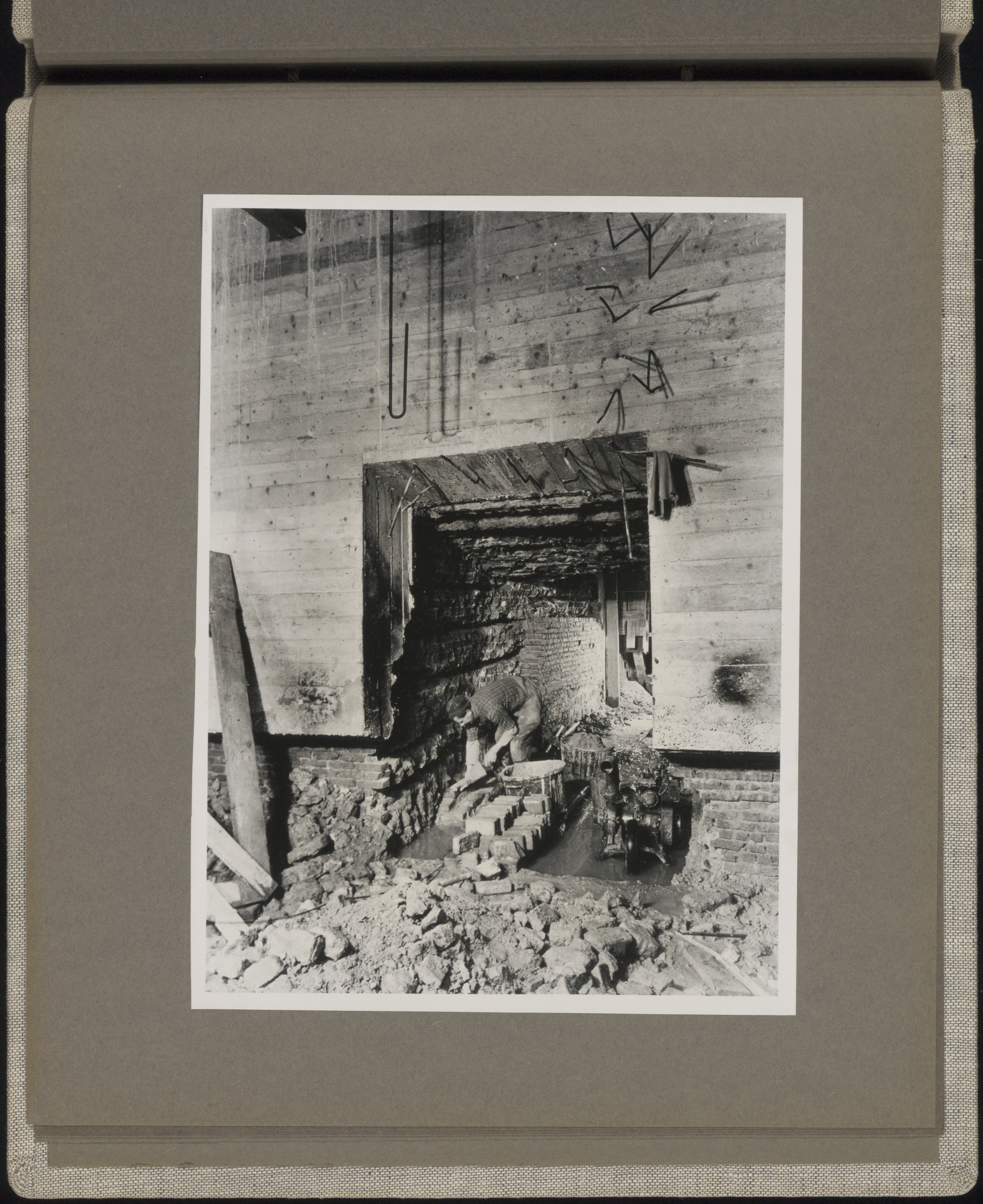 Aanbrengen bekledingsmetselwerk in de tunnelvormige balkgaten, gezien vanuit de torenruimte. nov.1953.