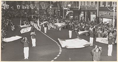 - feestelijkheden feestverlichting muziekkorpsen opticiens optochten publiek / toeschouwers vaandels