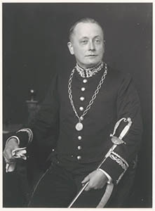 - Kniestuk naar links, het hoofd naar rechts, van G.F. de Roo van Westmaas, burgemeester van Dubbeldam van 1914 - 1945, zittend, in uniform met sabel, handschoenen in rechterhand en ambtsketen.