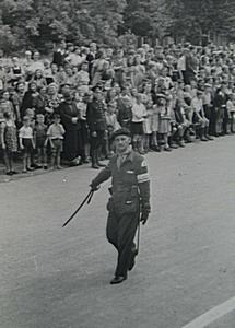 - militairen / soldaten oorlogstijd optochten politie publiek / toeschouwers Tweede Wereldoorlog