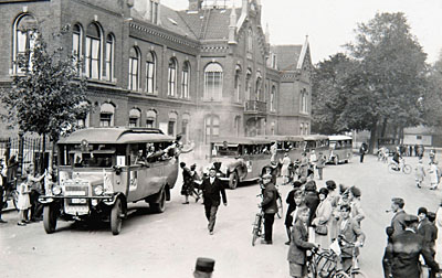 Vanaf het arbeidsbureu op het Beverwijcksplein vertrokken vijf bussen met deelnemers …