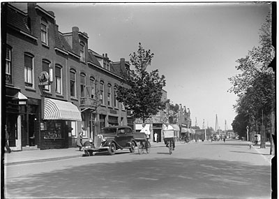 - De Krispijnseweg in noordelijke richting. De winkel van De Gruyter is op de hoek van de Vondelstraat. Op de voorgrond sigarenmagazijn Van Eck.