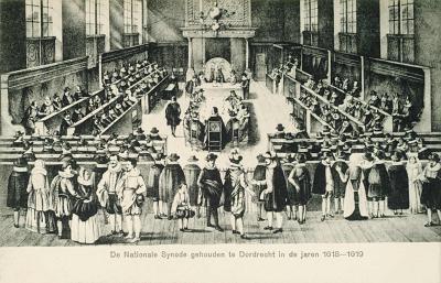 De Nationale Synode gehouden in de Kloveniersdoelen in de jaren 1618-1619.