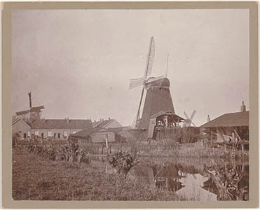 - De paltrok-houtzaagmolen De Kleine Noordsche Boer aan de zuidzijde van de noordelijke arm van de Weeskinderendijk. Deze molen is afgebroken in 1895. Links molen De Pelikaan, rechts molen De Zeelt.