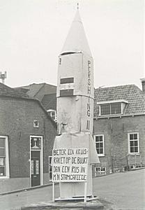 Kartonnen Pershing II-raket met tekst "beter een kruisraket op de buurt dan een Rus in …