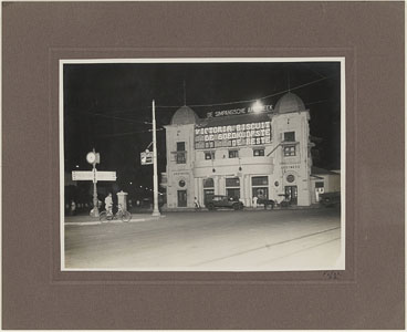 - Lichtreclame voor Victoria biscuit op de gevel van de Simpangse apotheek in Simpang op Java.