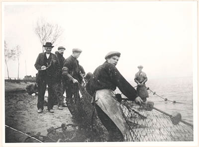 - Zalmvissers trekken een net aan wal nabij de Kop van 't Land. Links Izak 'de Goffer' (stond bekend om zijn vloeken) 2e van links zijn zoon Izak jr.